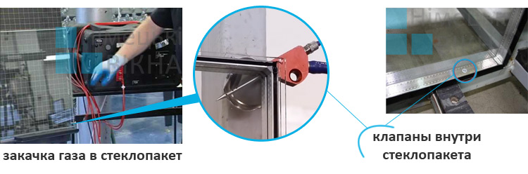 Косвенным признаком наличия газа в стеклопакете может служить присутствие клапана для закачки, врезанного в дистанционную рамку. В то же время, существуют специальные герметичные камеры для наполнения стеклопакетов инертным газом. Этот метод не требует установки клапанов и является более прогрессивным, так как обеспечивает стопроцентную наполняемость при низкой естественной утечке не более 3% в год. Это гарантирует 15-летнюю службу такого стеклопакета.