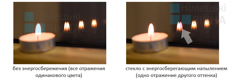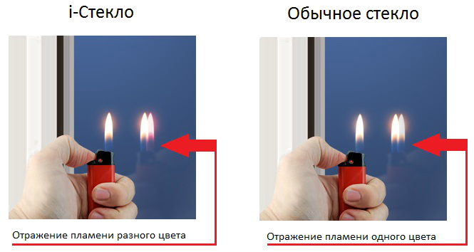 Внешний вид энергосберегающей продукции не отличается от обычных окон, поэтому покупателя довольно легко обмануть. Единственный подручный способ избежать обмана – внимательно посмотреть на отражение. Лучше всего использовать спичку или зажигалку, который подносятся к стеклу. Необходимо смотреть на цвет огня, который отражается во втором стекле. Если цвет отличается от оригинального, значит, камера внутри наполнена газом. Он изменяет пропускающие свойства, что и меняет цвет пламени в отражении.