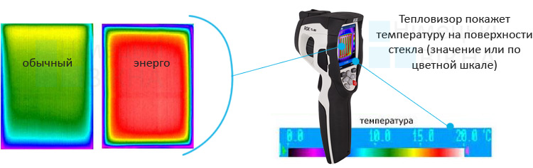 При обследовании тепловизором энергосберегающиего пакета будет наблюдаться совсем другая картина. Вы не увидите теплых или холодных зон. Поверхность стекла будет нагрета равномерно по всех поверхности, и будет иметь температуру на 5-8 градусов выше, по сравнению с обычным стеклопакетом.
