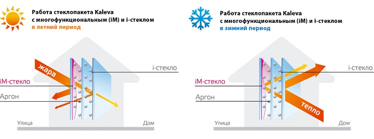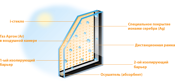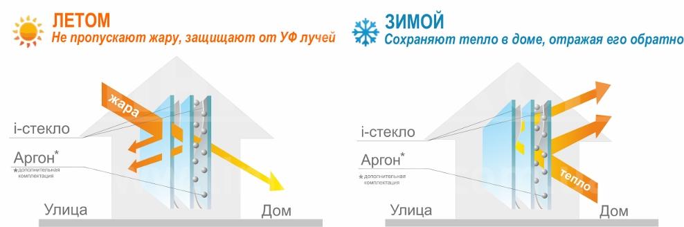 На стекло, обращенное к помещению, с внутренней стороны пакета напыляют тончайший слой ионов серебра, получая так называемое i-стекло. Оно обладает способностью отражать тепловую энергию (инфракрасное излучение), исходящую из нагретого жилья. Реализованный, таким образом, «принцип термоса» способен уменьшить теплопотери не менее чем на 80 процентов.