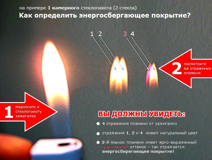 Существует достаточно эффективный подручный способ определить, какой перед вами тип стеклопакета – обыкновенный или энергосберегающий. Поднесите зажженную зажигалку или спичку к стеклу. Вы увидите двойное отражение пламени, которое у обычного стекла одного цвета; низкоэмиссионное даст отражение из двух оттенков.