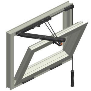 Этот фрамужный открыватель применяется на вертикально встроенных прямоугольных окнах с откидными, подвесными, вращающимися и среднеповоротными створками, открываемыми вовнутрь, из дерева, ПВХ или легкого сплава.