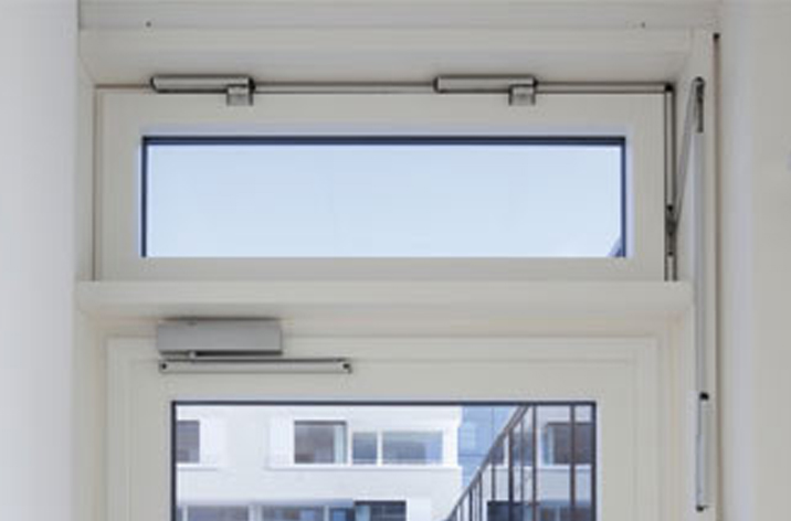 Благодаря небольшой высоте возможна незаметная установка в импостно-ригельных конструкциях. Благодаря плоской конструкции ножниц и отводу штанги требуется мало места над створкой окна и сбоку. Вид фасада остается без изменения.