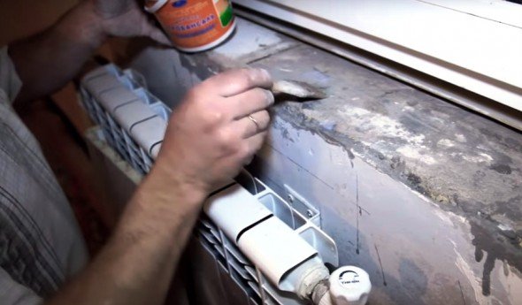 Лучшим способом нагреть баллон является помещение его в теплую воду. Но можно воспользоваться и системой отопления, если монтаж пластикового подоконника проходит с осени по весну. Нагретый баллон хорошо встряхивают, перемешивая его содержимое. Далее начинается заполнение пространства под плитой. Пустот не должно оставаться.