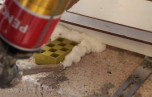 На этом работа не заканчивается. Дело в том, что полиуретановая пена отличается огромным расширением. Данное обстоятельство оказывает негативное влияние на положение доски между откосами. Чтобы не испортить работу необходимо укрепить элемент. Многие для этой цели используют обычные кирпичи, которые устанавливаются на поверхность плиты.