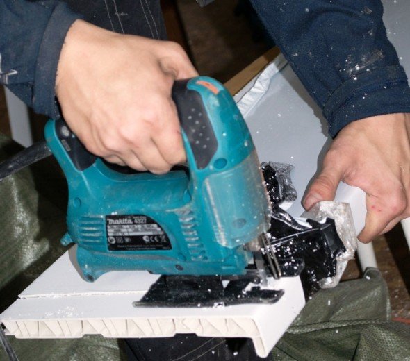 Также по бокам пластиковой заготовки нужно вырезать прямоугольники, которые позволяют ему без труда войти под откос. Резать пластик довольно просто. Для этого применяют ножовку, болгарку или электрический лобзик. Если при обрезании материала появятся зазубрины, то переживать не стоит, поскольку все дефекты скроются накладками из пластика.