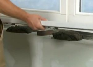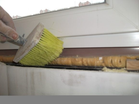 После выполнения всех перечисленных манипуляций нужно очистить подставочный профиль и нижнюю часть окна от кусков штукатурки и пыли, поскольку эти материалы используются для установки подоконника. Затем очищенные поверхности увлажняют, лучше для этих целей применять грунтовку, которая укрепляет поверхность.