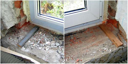 Пазы в откосах сделать лучше всего долотом, которое мы устанавливаем в перфоратор. Они должны иметь ровную форму, что не будет препятствовать вхождению подоконников. После долбления проём требуется очистить от мусора. А после этого приступать к следующему этапу.