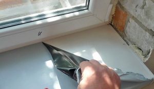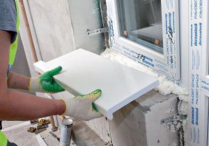 После примерки, когда правильная позиция будет достигнута, приступают к этапу крепления. Данное действие производится монтажной пеной, равномерно заполняющей пространство. Но перед тем как установить подоконник, баллон требуется немного нагреть. Температура позволяет повысить эффективность пены, которая лучше заполняет свободные места.