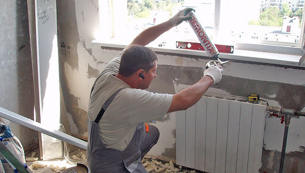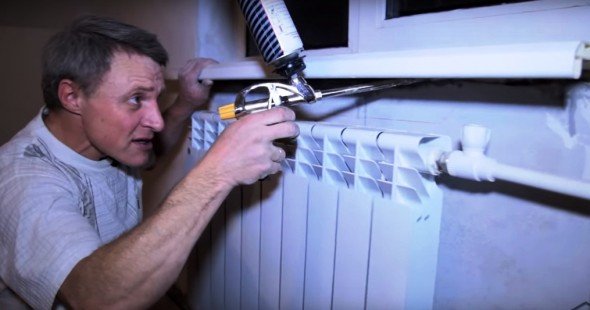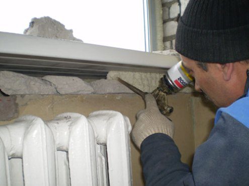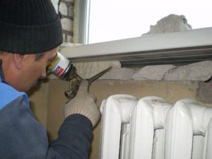 - Задуваем всё свободное пространство под подоконником монтажной пеной. Используйте специальный пистолет, чтобы герметик не разбрызгивался по сторонам и не попадал на одежду.