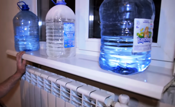 - Равномерно устанавливаем груз на плиту. Это не позволит пене поднять подоконник. Здесь важно не перегрузить конструкцию, так как её поверхность может деформироваться. Зачастую в качестве груза используют 3–4 бака с водой объёмом в 5 литров.