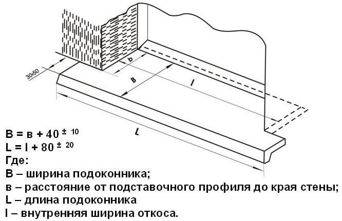 Ширину вычисляют по формуле: ширина выступающей части подоконника + глубина заглубления полотна в подставочный профиль + ширина поверхности под подоконное полотно.