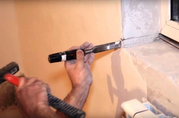 - Откосы выполнены из гипсовой штукатурки. В таком случае осуществить процедуру можно при помощи молотка или стамески.