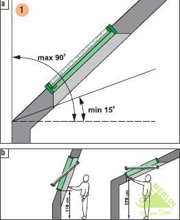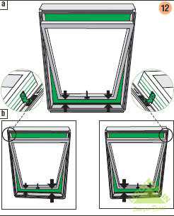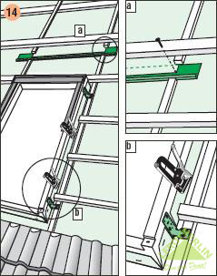 14. В том случае, если при строительстве крыши применяется гидробарьер, необходимо в подготовленное место над окном установить дренажный жёлоб для отвода конденсируемой влаги в сторону от окна (рис. 14а), а также прикрепить гидробарьер к оконной коробке (рис. 14b).