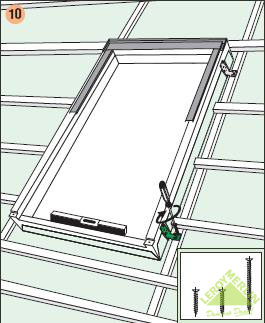 10. Установить оконную коробку в подготовленном месте крыши. Монтажные уголки должны опереться на стропилах (рис. 10). Проверить, совпадает ли паз на оконной коробке с верхней плоскостью обрешётки (рис. 9). С помощью уровня проверить горизонталь нижнего края окна. В случае необходимости, подкладывая под уголок клин, установить горизонталь. Прикрутить шурупами к стропилам только нижние уголки.