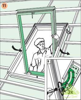 11. Вставить створку окна в оконную коробку. Для этого необходимо: взять створку в руки (рис. 11), т.е. наружным стеклом к себе, а низ окна кверху; удерживая створку в вертикальном положении вложить её снаружи в петли равномерно без перекоса; выкрутить блокировочные винты на три оборота против часовой стрелки (рис. 11 а), и закрыть окно;