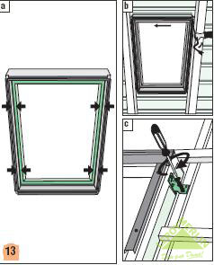 13. Закрыть окно и проверить параллельность щели между створкой и коробкой по бокам (рис. 13а). В случае необходимости, передвигая верхнюю часть коробки влево или вправо, устранить непараллельность (рис. 1Зb). Прикрутить шурупами к стропилам верхние уголки (рис. 13с),