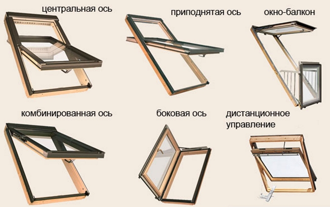 Устройство мансардных окон бывает различным — отличается методика открывания. Выделяют следующие разновидности, относительно расположения оси: