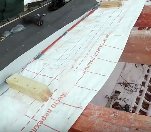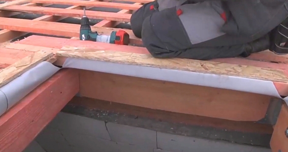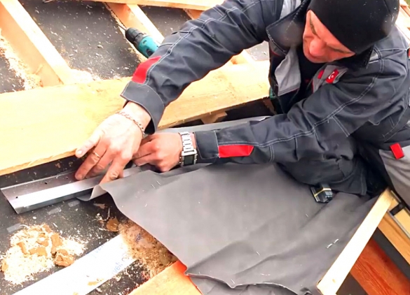 Дренажный желоб делается в верхней части рамы. В обрешётке прямо над проемом вырезают два куска под размер дренажного желоба. Подобных же размеров готовят и отрез гидроизоляционного материала. Желоб заводится под обрезки гидроизоляции и крепится к обрешетке. Устанавливать его требуется обязательно под углом, иначе герметизация будет страдать – дождевая вода может пойти в окно.