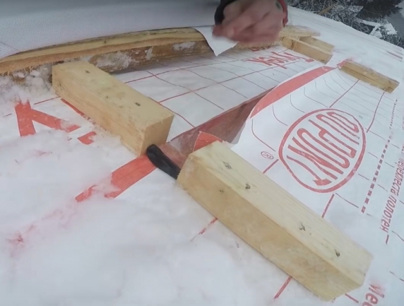 5. Обозначить на гидробарьере место установки окна. Вырезать в обозначенном месте отверстие с запасом 10 см с каждой стороны, чтобы потом прикрепить гидробарьер к оконной коробке. Вырезать часть обрешётки в подготовленном месте. Для установки дренажного жёлоба вырезать фрагменты контробрешётки и надрезать наклонно гидробарьер (рис. 5).