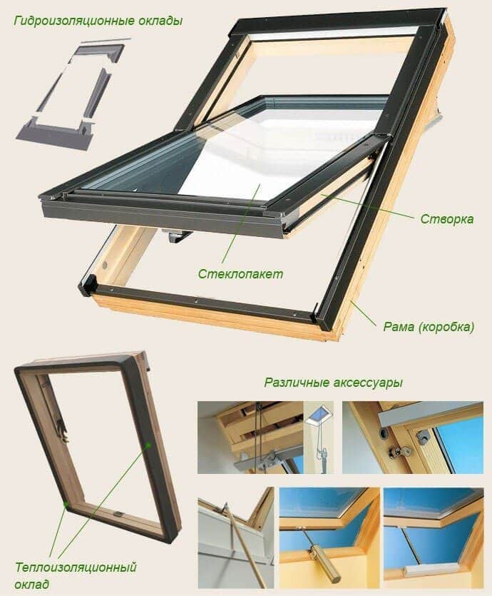 Состоит данная конструкция из створок, рамы и особой фурнитуры. Обязательно наличие гидро- и пароизоляционного фартука. Этот элемент позволяет избегать протечек. Наличие дополнительной теплоизоляции обязательно для сурового российского климата.