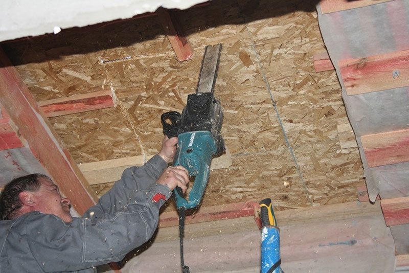 Руководствуясь этими правилами, вы должны вырезать проем (лучше воспользоваться бензопилой). Эта процедура довольно проста. Однако если у вас уже установлен кровельный материал и сделана внутренняя отделка, то это будет гораздо сложнее. Вы должны знать внутреннее расположение стропил. Идеально, если у вас под рукой имеется схема.