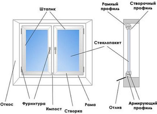- рама – несущий каркас из ПВХ, иногда усиленный металлическими пластинами, который называют рамой;