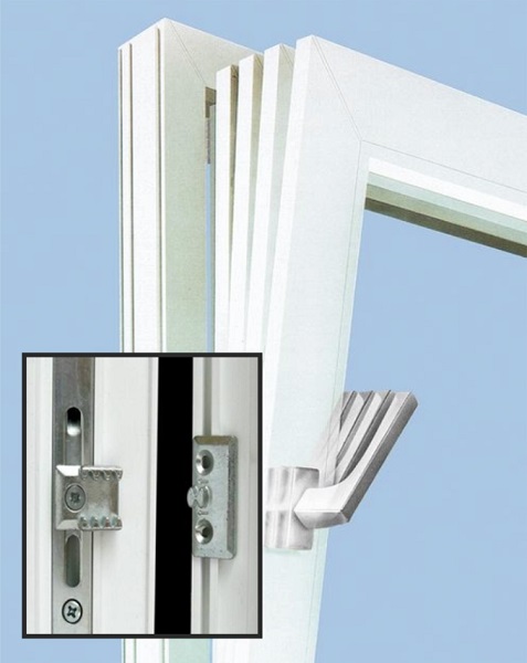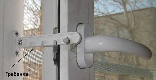Состоит из двух элементов – планки со специальными выемками (крепится на раму) и ответного выступа на створке, который входит в зацепление с выемками планки.