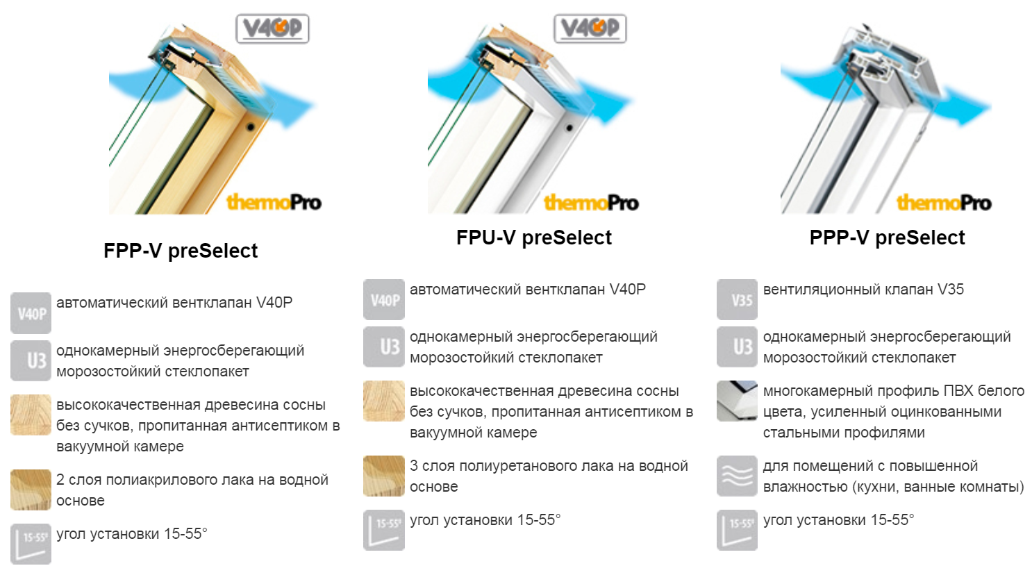 - PTP U3, PTP-V U3, PTP U4 – среднеповоротные мансардные окна;