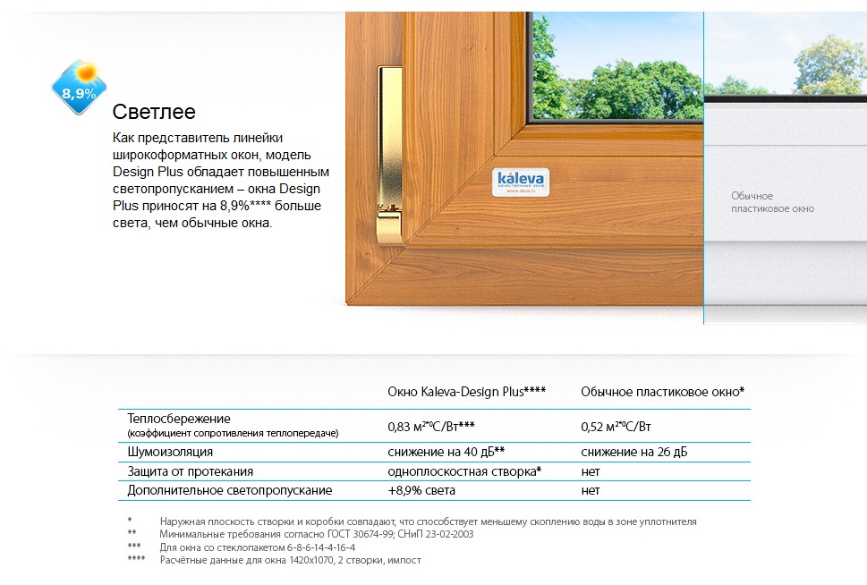 Кроме увеличенного на 7% значения светопропускания, окна получились на удивление тихими. Если сравнивать стандартную модель окна с Design Plus, то преимущества на стороне этой модели. Если стандартное окно снижает уровень шума на 26 Дб, то Kaleva Design Plus на 40 Дб!