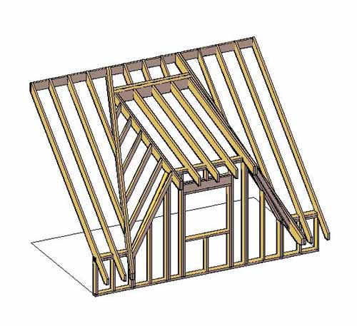 После того как стропильные ноги будут установлены, на них ставят поперечные балки, Нижняя балка должна находиться на одном уровне со стеной, а верхняя — совпадать с высотой окна. Верхний брусок, располагающийся поперек, будет держать вертикальные стойки конструкции. Полученная рама должна быть скреплена брусом, который кладут вдоль . После этого по образу стропил крыши делают стропильную систему для слухового окна.