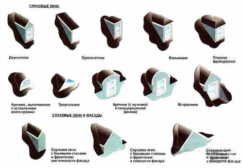 Слуховое окно имеет от мансардного конструктивные отличия. Прежде всего, оно требует наличия водосточного желоба, поэтому уклон крыши должен быть не меньше 5 градусов. Популярнее всего конструкция, имеющая форму четырехугольника.