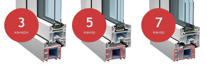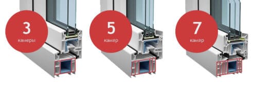 Для усиления конструкции, повышения показателей звукоизоляции и коэффициента сопротивления теплопроводности, в полости профиля ставят перегородки, которые образуют воздушные камеры. Чем большее число камер, тем теплее и тише в доме. Минимально возможное число камер — 3, максимальное — 7. Для примера приведем изменение показателя звукопоглощения для оконного блока: