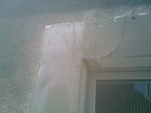 Чтобы добиться максимальной прочности, можно проделать армирование стеклопластиком. Для этого стекловолокно нарезают лентами, ширина которых соответствует ширине откоса. Фиксируют ленты степлером, после чего закрепляют клеем. Когда клей высыхает, армировку принято шпаклевать, как показано на фото выше.