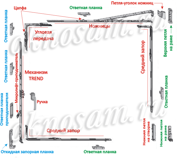 Существует несколько видов фурнитуры от разных производителей (MACO, ROTO, SIEGENIA и др.), но все они объединены общим принципом работы и универсальны в том плане, что могут быть установлены на любой тип оконного профиля. Ниже на примере поворотно-откидной фурнитуры MACO детально изображены все элементы фурнитуры (красным шрифтом подписаны элементы, устанавливаемые на створке, зелёным – на раме). Элементы расположены в том порядке, в котором они были бы установлены на створке с правым открыванием (правая створка – это створка, открывающаяся на правую сторону, если смотреть на неё со стороны помещения).