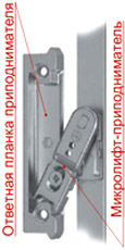 Чтобы при переводе створки в режим проветривания откидной запор (нижний угол) вошёл в зацепление с запорной планкой на импосте, а не проскочил мимо, ручку нужно поворачивать, предварительно прижав створку к раме. От случайной ошибки фурнитура защищена устройством блокировки, не позволяющим вращать ручку, пока створка на прижата к окну. Эту задачу выполняет специальный рычажок, расположенный рядом с ручкой – микролифт (показан на рисунке справа). Вторая его функция – защита створки от провисания, чем обусловлено второе его название – микролифт-приподниматель. Дело в том, что при запирании створки цапфы двигаются вверх (имеется в виду сторона ручки), и испытывают встречное сопротивление ответных планок, чем соответственно отталкивают саму створку вниз, заставляя её постепенно провисать. Правильно отрегулированный по высоте микролифт мягко упирается в ответную планку приподнимателя на импосте (см. рисунок), не давая створке испытывать «перегрузки» при закрывании.