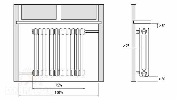 Высота радиатора над полом должна быть не менее 10 см, а расстояние между верхней точкой радиатора и подоконником — не менее 8 см.