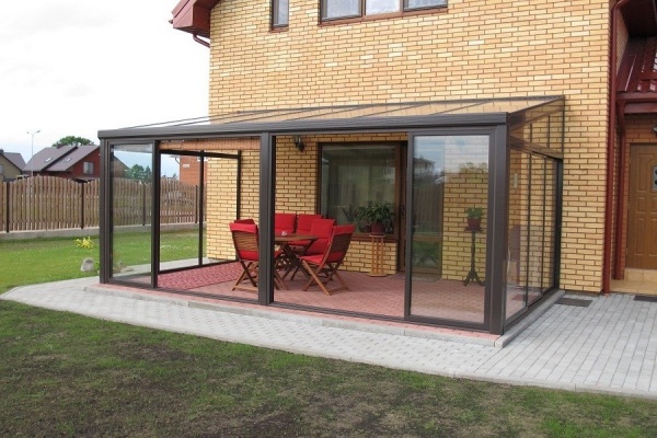Все пространство, отделяющее веранду от двора, будет отделено прочными листами стекла. Такие стекла можно в любое время отодвигать, что позволяет свободно проникать внутрь веранды.