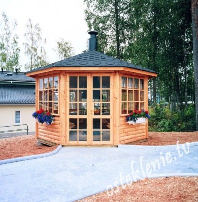 Беседки остекляют еще реже, чем веранды. Как правило, эти конструкции выполняют из деревянного брусаих форма может иметь прямоугольные или округлые очертания. Раздвижные окна подходят для остекления беседки как ничто другое.