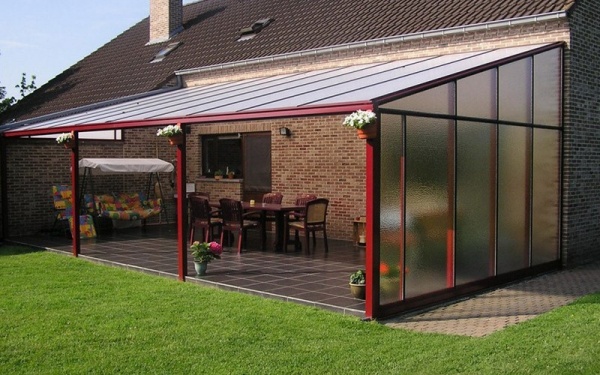 Еще одним недорогим материалом для остекления веранд и террас служит поликарбонат. Этот материал создан на основе полимеров с использованием разнообразных присадок. Он успешно заменяет хрупкое и тяжелое стекло, обладая при этом целым рядом достоинств.