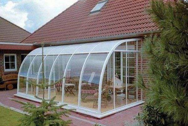 Преимуществом использования этого материала для застекления веранды в том, что поликарбонат легко гнется, тем самым можно придать окнам округлую форму и придать своей веранде большую индивидуальность.
