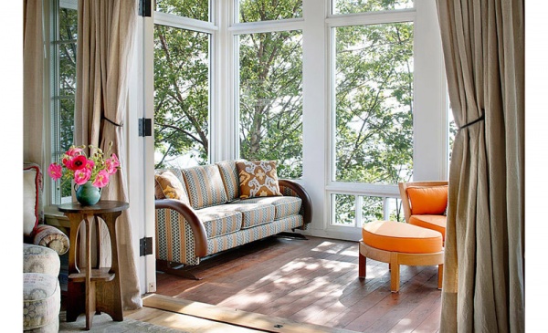 Шторы позволяют создать интимную атмосферу, укрывая все происходящее на веранде или террасе от нежелательных взглядов. Их можно удачно сочетать с интерьером помещения или его наружной отделкой. Иногда цветные шторы применяют в комбинации с обычными стеклами.