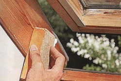 Ремонт мансардных окон (деревянных) начинается с осмотра и выявления мест гниения или поверхностного разрушения. Эти места тщательно зачищаются, шлифуются, затем древесина окна заново покрывается лаком.