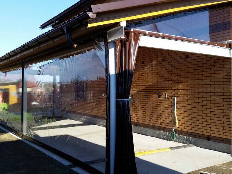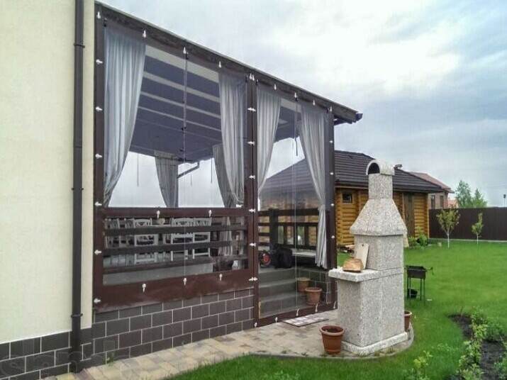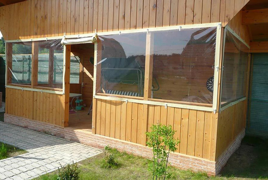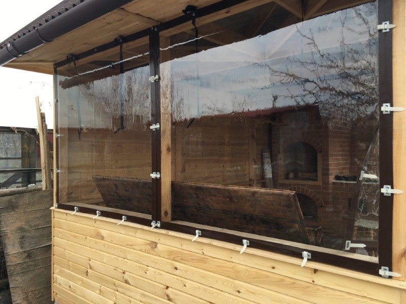 - Мягкое. В этом случае вместо привычных стекольных панелей используется гибкая прозрачная ПВХ-пленка. Способ куда дешевле предыдущего, выполнить все необходимые действия по остеклению можно самому. Защита от неблагоприятных погодных условий получается вполне надежной, в беседке даже осенью будет тепло и уютно. Существуют разноцветные варианты пленочного покрытия. Но не всем понравится, сидя в беседке на даче, ощущать в воздухе запах пластика. Зато перекрывать получится даже большие проемы и без всяких перемычек.