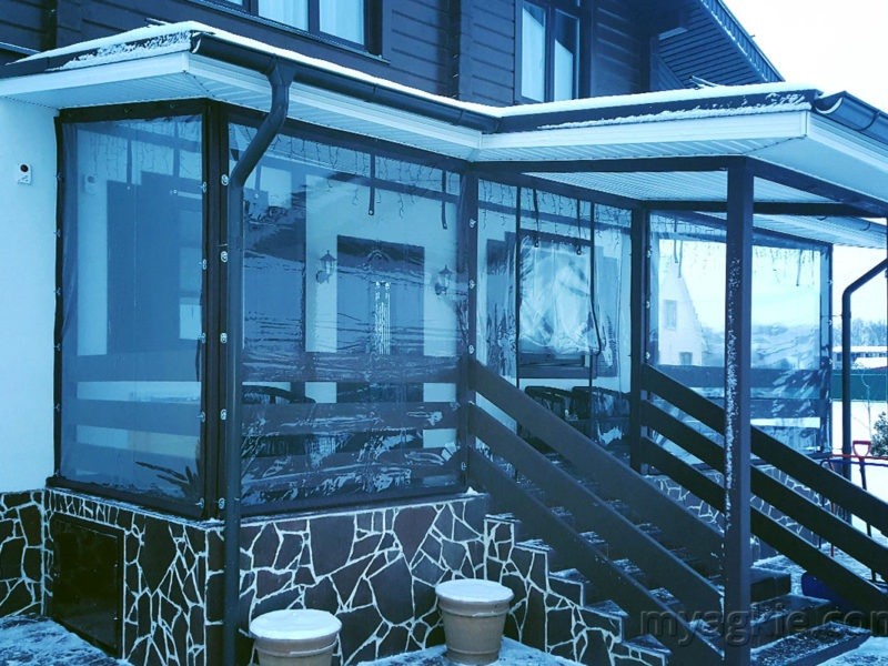 В качестве материала выступают описанные ранее ПВХ-пленки. Служит такое покрытие около 10 лет, пропускаемость света – 90%. Даже двери можно сделать гибкими с застежкой на молнии.