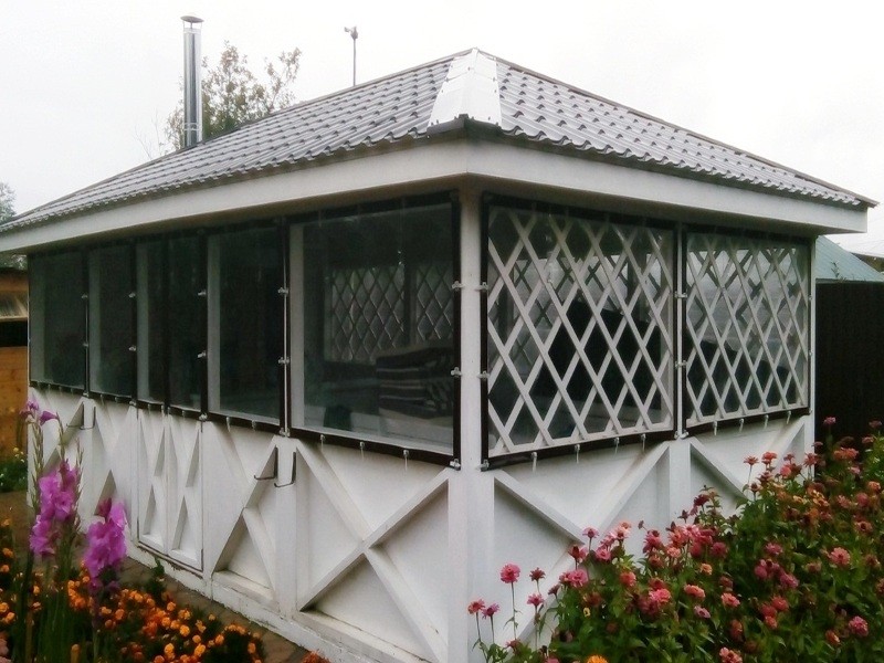 Различные варианты остекления можно комбинировать, совмещая те или иные структурные элементы. Чтобы целиком закрыть беседку, применяют следующие материалы: