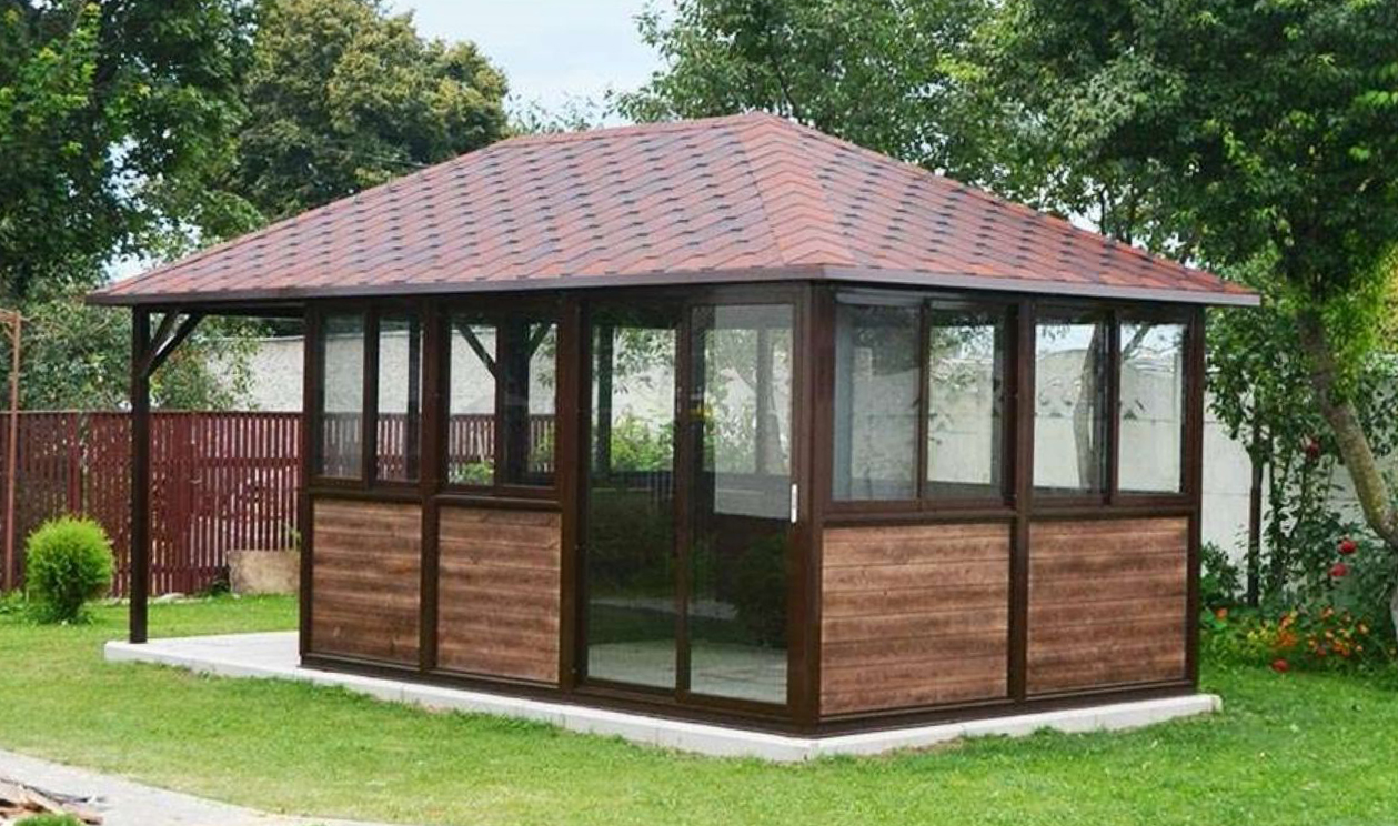 При остеклении беседки ПВХ окнами лучше выбрать облегченные трехкамерные профили. Если белый цвет не вписывается в ландшафт – его можно изменить посредством ламинирования. Наиболее популярным является имитация дорогих пород дерева.