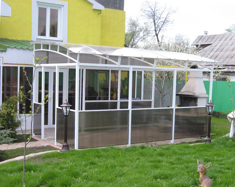 - Алюминиевый профиль. Подходит для небольших строений. Хотя чаще всего с его помощью организовывают холодное остекление, при наличии мангала или камина можно добиться вполне комфортных условий даже зимой. Обработанный алюминий не боится ржавчины, профильные рамы не занимают большой площади и не препятствуют обзору. Створки обычно делают из одинарного стекла, но можно заказать и теплый стеклопакет. Кроме того, в алюминиевый профиль вставляют поликарбонатные листы или тонированные стекла.