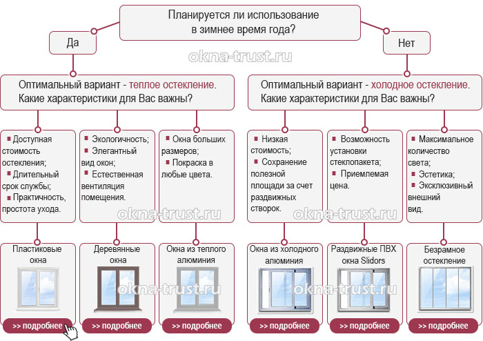 Еще одним «но» безрамных систем является невозможность установки москитной сетки, когда хочется открыть окно, но, как часто бывает летом, досаждает мошкара. Как выбрать окна?При выборе окон для беседки компания “Окна Траст” рекомендует руководствоваться нижеприведенной схемой.