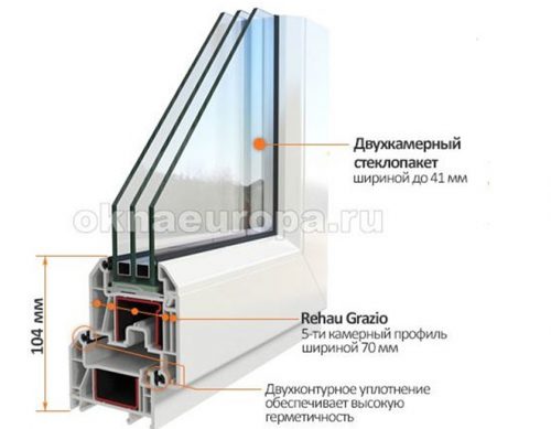 Для нашего умеренного климата идеальным вариантом станут пятикамерные профили ПВХ. Они сохранят тепло в помещении и оградят его от проникновения звуков извне. Особое внимание читателей я бы хотел обратить на одну из новинок от компании Рехау – профиль Rehau Grazio. Это модель, которая прекрасно сочетает в себе улучшенное качество предыдущих разработок и стильный дизайн. Для наглядности предлагаю пример рамы в разрезе.